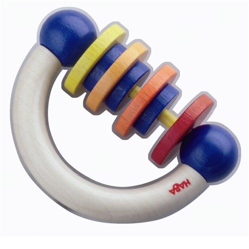 Clicking and clacking wooden discs on a metal rod. Made from maple, beech and metal. Measures 4` across. Recommended for 6 months and up. Made in Germany.