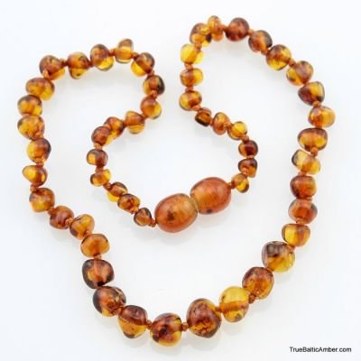 WHAT IS AMBER TEETHING NECKLACE? A Baltic amber teething necklace is made for wearing (not chewing) when a baby is teething. The warmth from the skin releases the active ingredient in the Baltic amber, succinic acid. Recent scientific research has proved that succinic acid has a very positive influence on the human body. It improves immunity and the balance of acids when absorbed into the bloodstream (which will help keep mom calm too); it stimulates the thyroid glands to help reduce drooling and soothes red inflamed cheeks. Amber's anti-inflammatory and therapeutic properties are recognized by allopathic medicine as a natural analgesic, which will help to relieve teething pain and calm a baby without resorting to drugs. The skin's warmth releases healing oils from the amber, a resin, which is absorbed into the bloodstream. The beads are individually knotted for safety. Keep in mind (Amber has slight color variations that make it lighter or darker. Amber is approximately 60-90 million years old so each piece is slightly different.) Parent supervision is recommended. 11-13 inches also comes with Comes with a customized jewelry pouch by "The Art of Cure"