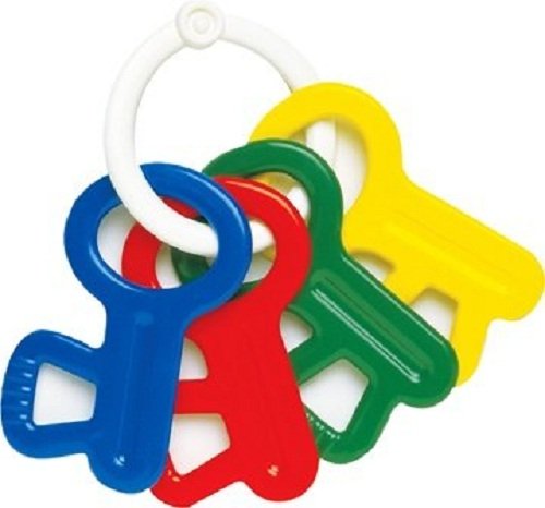 Four brightly colored giant keys safely collected onto a sturdy ring for rattling and teething.