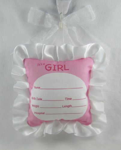 It's a Girl! Announce the birth of your baby girl to the world with this elegant door hanger pillow. Fill in the details with included pen. Hang on Mommy's hospital door and then on Baby's nursery door or wall. Trimmed with white satin ruffle and sheer organza ribbon for door hanging. Assembled in the USA. Ships with white organza gift bag. Lovely baby shower gift for any expecting parent. Perfect keepsake.