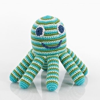 This crochet octopus rattle was the first product Samantha Morshed designed when she decided to launch the Pebble brand. Remembering how her little ones had always liked rattles that you could both grab and chew at the same time, the octopus seemed a perfect match with its eight long legs. It's proved a huge hit and we are proud to be able to continue offering this product. At Pebble they like to think that their toys spread smiles worldwide: the ladies who make them in Bangladesh smile because the toys bring them work, the parents smile because the toys keep their babies happy and enable them to shop with a conscience and the babies smile - well you can see why! We hope you love this little rattle as much as we do. All Pebble products are made in Bangladesh by the extremely talented and capable artisans at Hathay Bunano ps. We love their workmanship and we love rural Bangladesh. Pebble toys are our small contribution to supporting families in rural Bangladesh, to removing the need for economic migration to the cities and to providing women with flexible working opportunities which are close to their homes. All Pebble toys are 100% cotton with 100% polyester fill. About 15cm. They are all machine washable and can be tumble dried on a low setting.