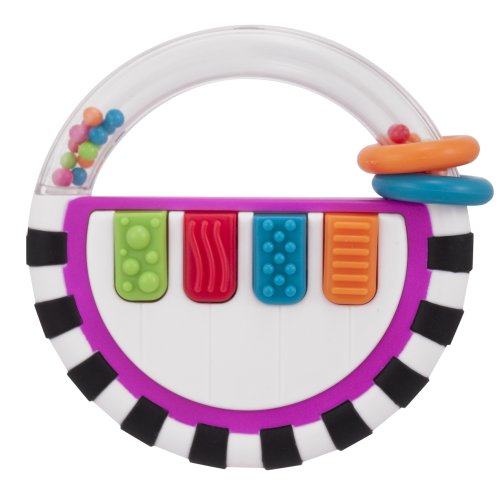 Sassy piano plays four piano tunes for baby to experience to develop hand and eye coordination. Large brightly colored keys to manipulate and easy to grasp. The handle is filled with beads that engages baby and keeps their attention. Inspires exploration for 6 plus months.