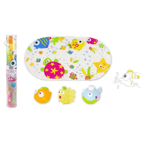- 4 Piece set includes a bath mat and 3 squirter toys